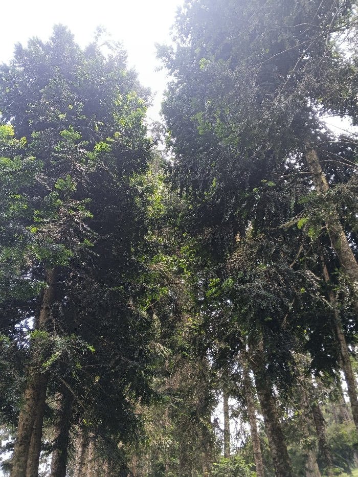 The image captures an upward view into a dense canopy of tall trees in Tapaiteng Uesa, Bhutan. Multiple evergreen trees, characterized by dark green, needle-like or scale-like foliage, dominate the frame. Their prominent, textured trunks are visible along the left and right edges, extending upwards. The bright, overcast sky is visible through gaps in the foliage, creating areas of light luminosity, particularly in the upper left quadrant. No individuals, animals, or man-made objects are present. The scene depicts a natural forest environment.