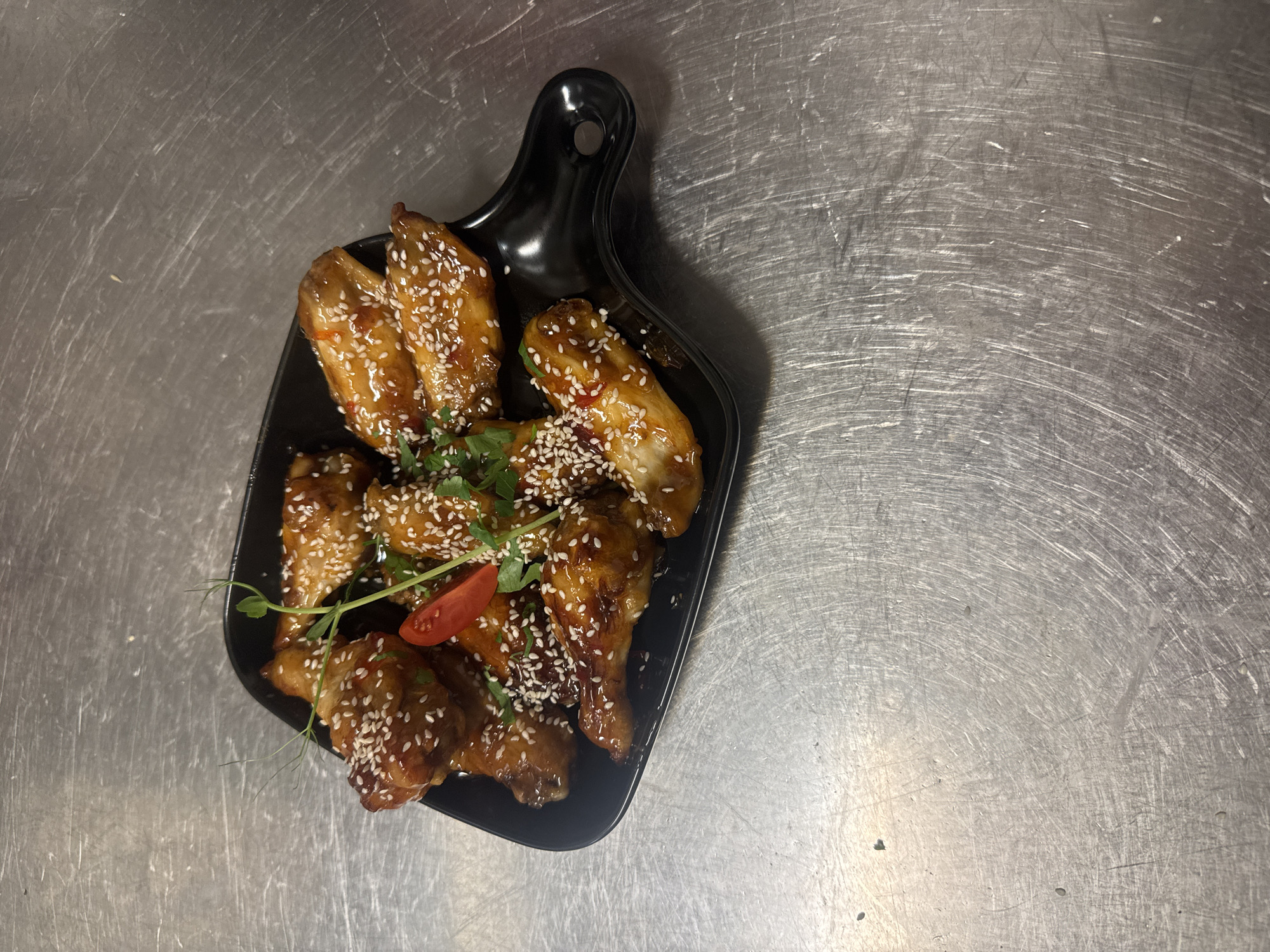 A top-down shot shows a black, decorative serving dish filled with what appear to be sesame chicken wings garnished with herbs and a slice of tomato