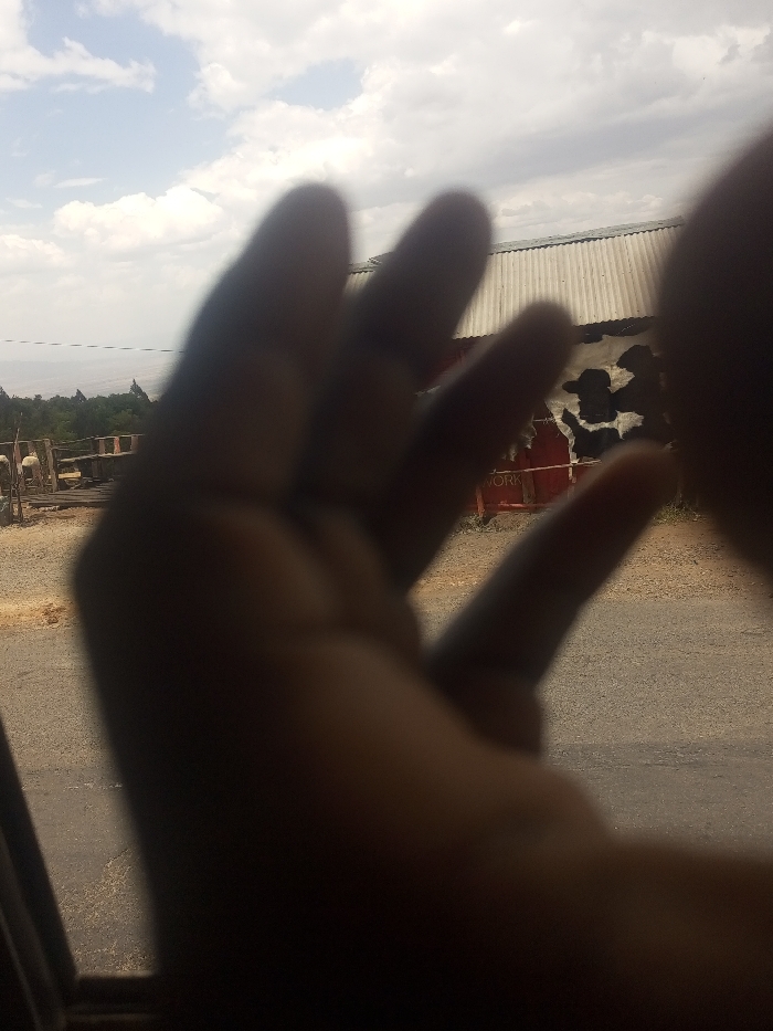 A blurry foreground hand obscures most of the image. Visible through the fingers is a corrugated metal building, with a painted black and white cow design on its side. A road stretches into the distance. A railing and some wooden structures are faintly visible in the background. The sky is cloudy. The photograph appears to have been taken from inside a vehicle.
