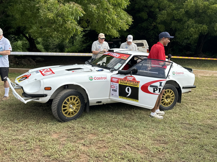 - "A white vintage Datsun 240Z/280Z rally car, marked with number 9, "2023 20th East African Safari Classic," "MRF TYRES," and "Castrol" sponsorships, is positioned on a grassy field in Gombato Bongwe ward, Kenya" by FM-tTf9t1, licensed under CC BY 4.0