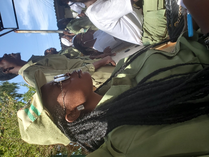 This image depicts an outdoor gathering in Jos, Nigeria, featuring multiple individuals, primarily young adults, many dressed in the distinctive olive-green uniform of the National Youth Service Corps (NYSC)