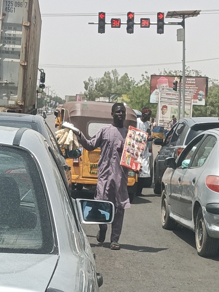 The image depicts a daylight street scene in Hotoro, Nigeria, focusing on a traffic intersection with stopped vehicles