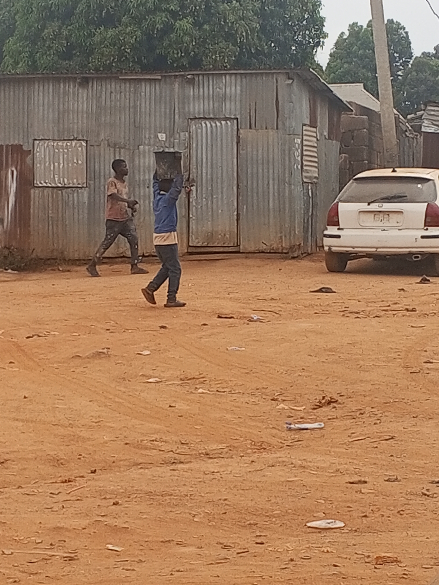 This image depicts an outdoor scene in Gura Top, Nigeria. Two adult males are walking across an unpaved, reddish-brown dirt ground. The male in the center is walking from left to right, carrying a dark, cylindrical container on his head, supported by his raised arms. He wears a blue long-sleeved shirt, dark trousers, and dark footwear. Slightly behind him and to the left, another male walks in the same direction, wearing a light-colored (possibly orange or brown) t-shirt, dark, stained trousers, and dark footwear or is barefoot. In the background, multiple structures are visible. A primary building on the left is constructed from corrugated metal sheets, featuring a square window opening on its left side and a centrally located door opening. To the right of this building, partially obscured, is another structure constructed from rough-hewn stone blocks, also topped with corrugated metal. Further to the right, a white hatchback car, possibly a Honda Civic, is parked facing away from the viewer, exhibiting red tail lights and a partially visible license plate. A tall, dark utility pole stands behind the car. Dense green foliage from trees is visible above the buildings and pole, against an overcast sky. The unpaved ground features scattered debris, including white plastic items and a dark flip-flop near the parked vehicle.