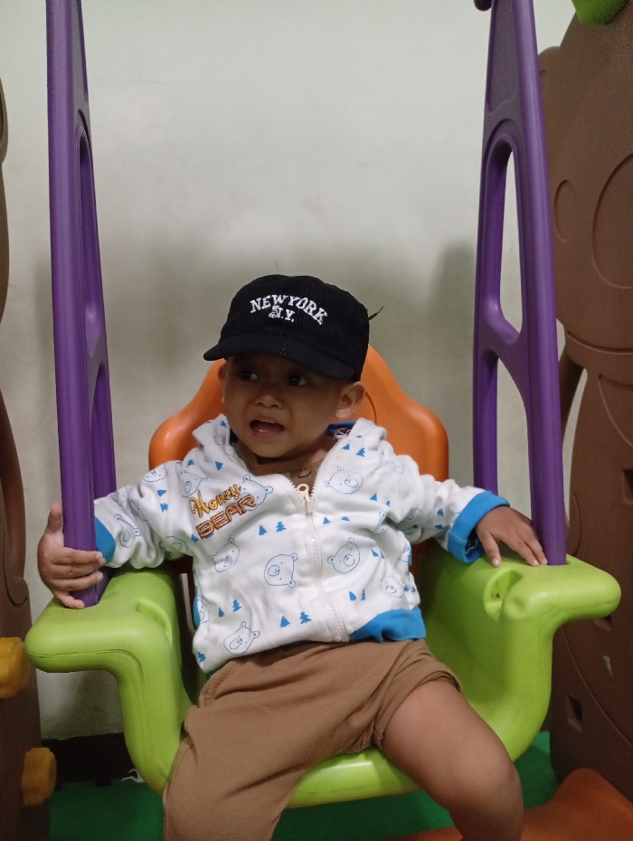 - "A young child wearing a black "New York" baseball cap, a white "Honey Bear" hooded jacket, and brown shorts sits in a green and orange baby swing" by FM-OkgR33, licensed under CC BY 4.0