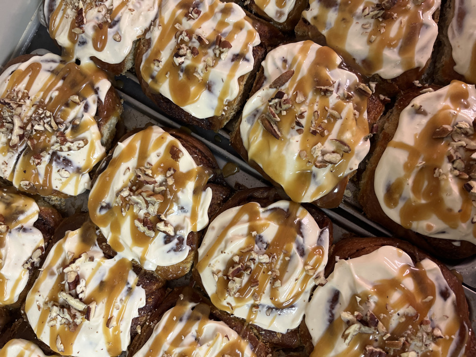 - "A close-up shot shows a tray of cinnamon rolls, lavishly frosted with white cream cheese icing and drizzled with a caramel sauce" by FM-4GKkh1, licensed under CC BY 4.0