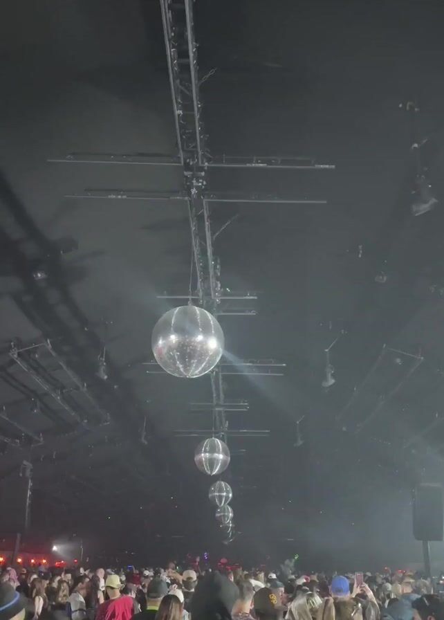A crowd of people are gathered in a dimly lit venue with red lighting. Several disco balls hang from the ceiling, illuminated by the lights. There are linear red lights and spotlights also illuminating the space. The video is taken from the perspective of someone in the crowd, looking up towards the ceiling and stage.