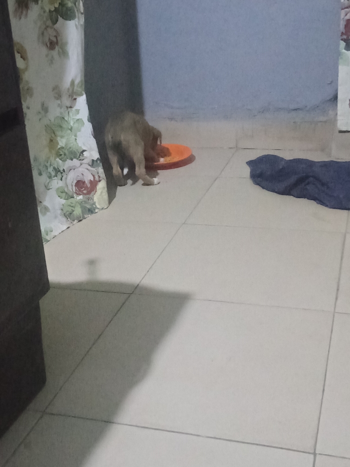 A brown dog stands near a curtain with floral patterns. The dog has its head down, seemingly eating from an orange dish. The background consists of a plain wall and white floor tiles. A dark blue cloth rests on the floor to the right of the dog. The scene is dimly lit, casting shadows on the floor.