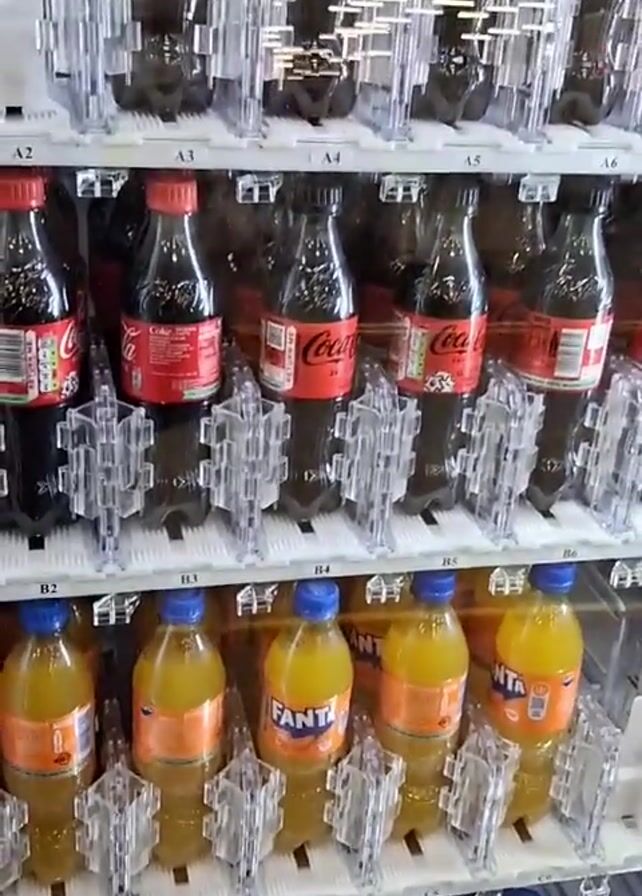 close-up of the interior of a vending machine, displaying rows of bottled drinks