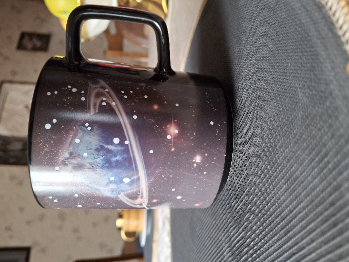 - "A black ceramic coffee mug with a galaxy and a planet design sits on a grey textured placemat" by FM-wd4E92, licensed under CC BY 4.0