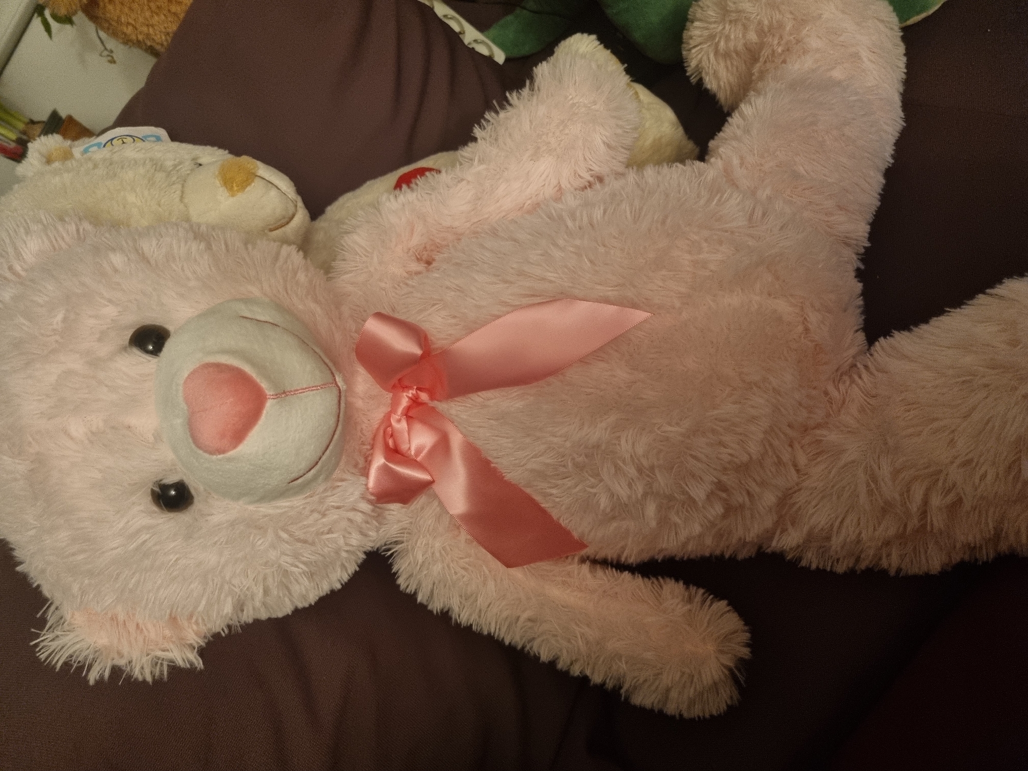 A plush, light-pink teddy bear with a pink ribbon around its neck lies on a dark brown surface