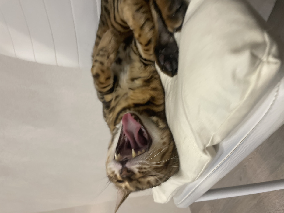 A blurry, upside-down view features a Bengal cat, likely on a bed. The cat's mouth is wide open in a yawn, revealing its tongue and teeth. Its body is stretched out, with one paw visible near a white pillow. The background appears to be a white wall or ceiling. A white bed frame is also visible near the pillow. The angle gives a dramatic and distorted perspective of the animal.
