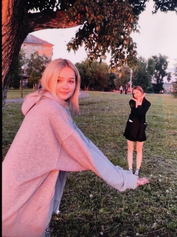 This image captures two young females positioned in a park-like green space within the city of Charleroi, Belgium, during what appears to be late afternoon or early evening. In the foreground, a fair-skinned female with shoulder-length blonde hair is visible from the waist up, facing the camera with a subtle smile. She wears a light grey hooded sweatshirt, illuminated with warm, pinkish-orange light on its surface. Her right arm is extended horizontally to the right with an open, upward-facing palm. A tree trunk partially occupies the extreme left of the frame. Approximately six to eight meters behind the foreground subject, a second female stands in the green grass, appearing smaller due to perspective. She wears a dark, possibly black, short-sleeved top with a collar and a dark, mid-thigh length skirt, paired with black and white patterned shoes. Her arms are raised, and her hands are positioned near her face in a stylized pose. The ground is covered in green grass with scattered small white flowering plants. In the mid-ground, a paved path curves through the park. In the distant background, several indistinct figures are visible on the path, beyond which stand various trees and multi-story buildings with light-colored facades, under a clear, pale pinkish-orange sky.