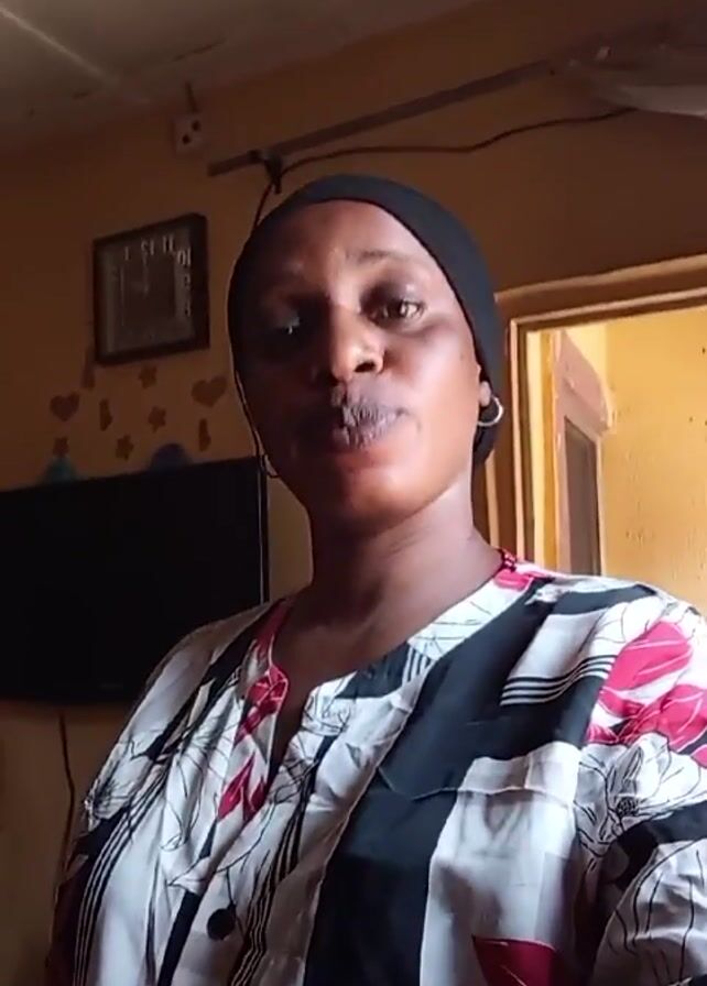 woman with dark skin, wearing a black head covering and a patterned top. The top is white with black, red, and grey designs. She is looking directly at the camera and slightly nodding her head. The background shows a room with yellow walls. There is a picture frame and a television on the wall behind her. A doorway is visible on the right side of the frame. The ceiling is white and shows signs of aging or wear. There is a faint image of hearts on the wall behind the television.