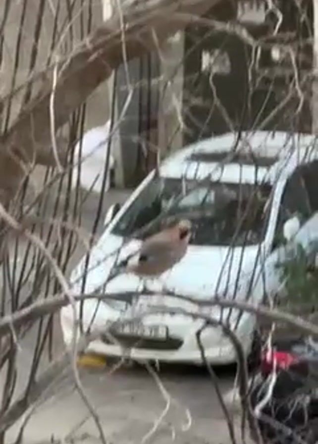 A medium shot captures a Eurasian jay perched on a bare tree branch, with a white car visible in the background