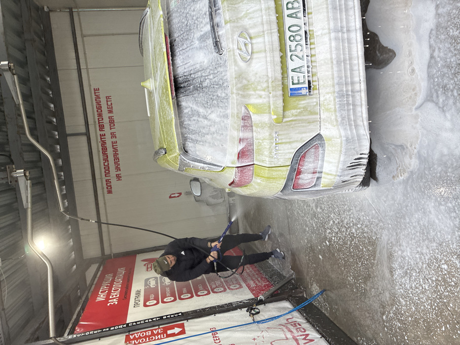 An adult male is observed washing a light green Hyundai Kona compact SUV inside a self-service car wash bay in Unknown, Bulgaria