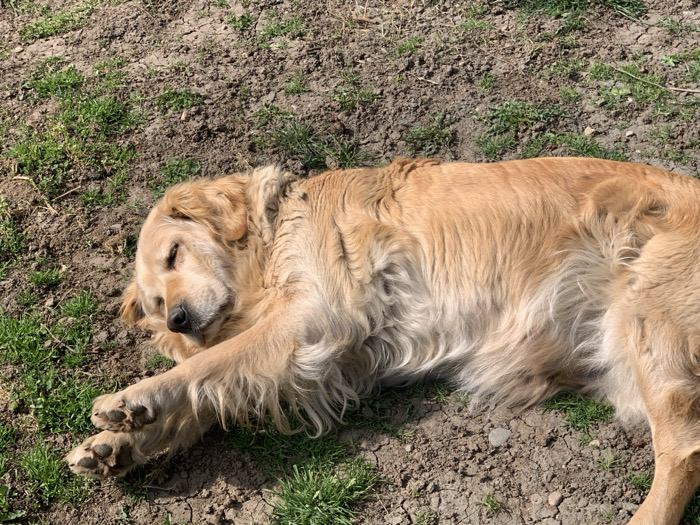 - "A Golden Retriever dog with light golden fur is observed lying on its left side, appearing to be asleep or resting, with its eyes closed" by FM-CrvUt2, licensed under CC BY 4.0