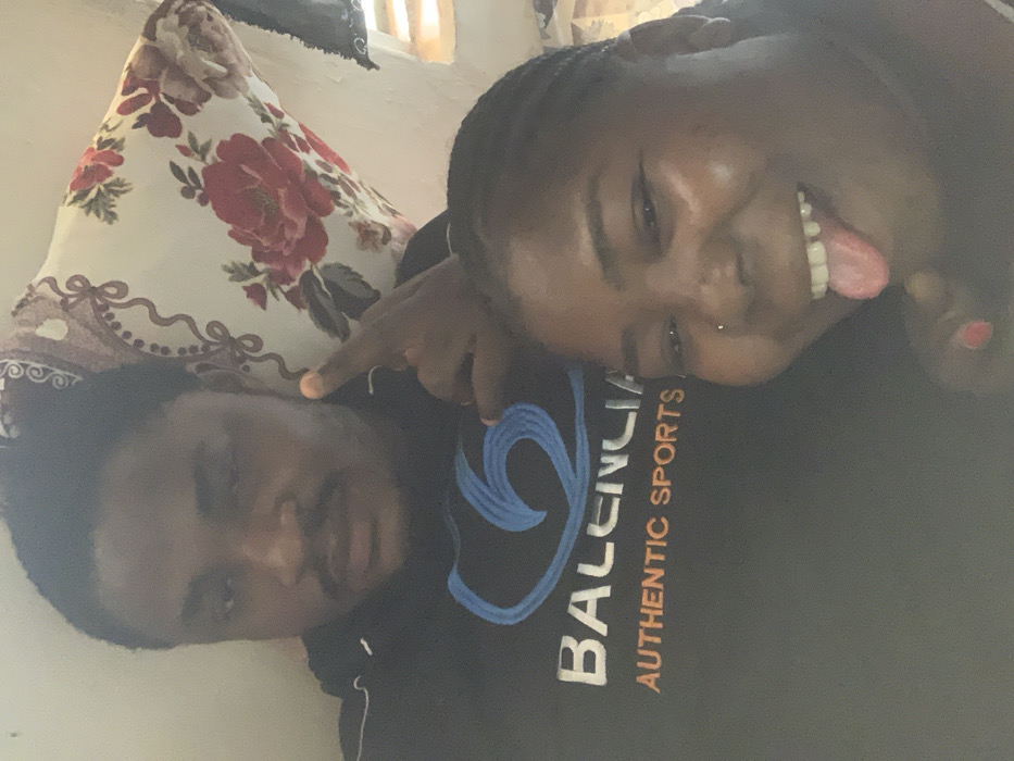 The scene is an indoor setting in the city of Akwanga, Nigeria. Two individuals, an adult male and an adult female, are visible in a close-up, likely selfie, composition. The male, positioned on the left, has dark hair, a mustache, and a short beard. He wears a black long-sleeved shirt featuring a blue graphic that reads "BALINCIA AUTHENTIC SPORTS." His right hand is raised, with the index finger pointing upwards near his head. He looks directly towards the viewer with a neutral expression. The female, positioned on the right, has dark braided hair and a nose piercing on her right nostril. She smiles broadly, with her tongue extended, and also looks towards the viewer. Her visible right hand shows red nail polish. In the background, a cream-colored pillow adorned with red floral and brown scroll patterns is situated behind the male's head. A plain light-colored wall is visible, with a dark, indistinct fabric object partially obscured on the far right.