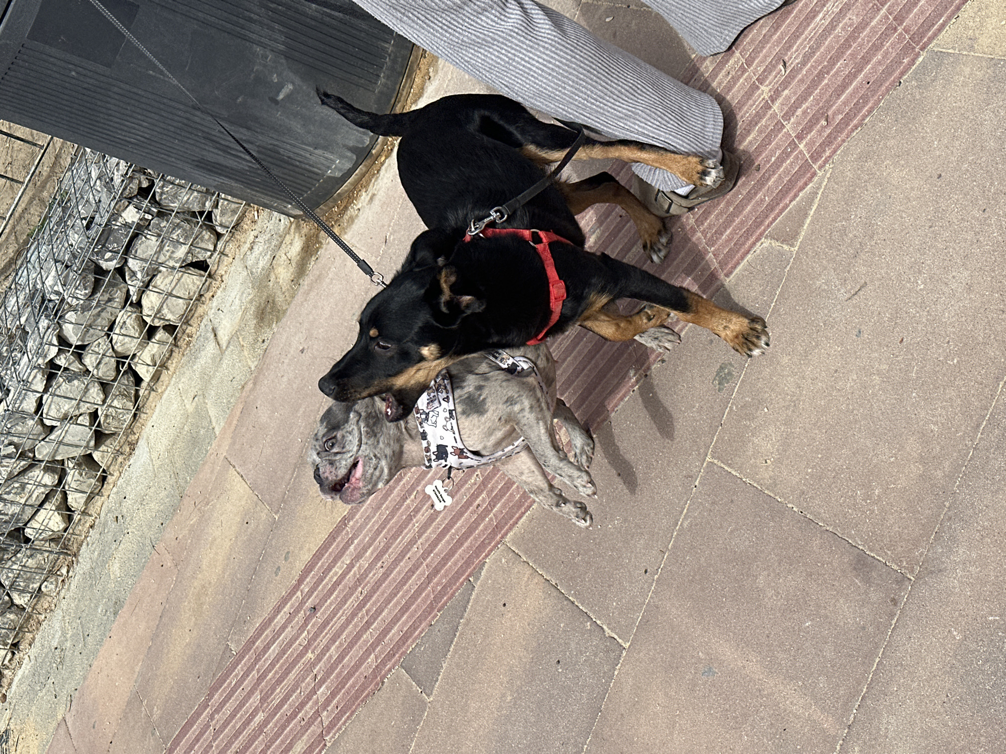 The image depicts an outdoor scene in Alicante/Alacant, Spain, featuring two dogs, the lower body of one human, and architectural elements. A merle-patterned dog, resembling a French Bulldog, is positioned on the left, captured mid-leap with its mouth open and tongue visible, looking upwards and towards the right. It wears a white harness patterned with cartoon dog faces and a white bone-shaped identification tag. To its immediate right, a black and tan dog, wearing a red chest harness, stands on all four paws, looking towards the merle dog. A black leash extends from the black and tan dog's harness, upwards and out of the frame. The lower legs and feet of a human are visible on the far right. The person wears light grey, vertically striped pants and tan open-toed sandals. The black and tan dog's front right paw is positioned near the human's right sandal. The ground is paved with light brown rectangular flagstones. A reddish-brown strip of tactile paving with parallel ridges runs diagonally across the lower-middle section of the image. In the upper background, a gabion wall, constructed from wire mesh cages filled with light-colored rocks, is visible. A dark, featureless cylindrical object is partially visible on the far right, behind the human's leg. The scene is illuminated by strong overhead daylight.