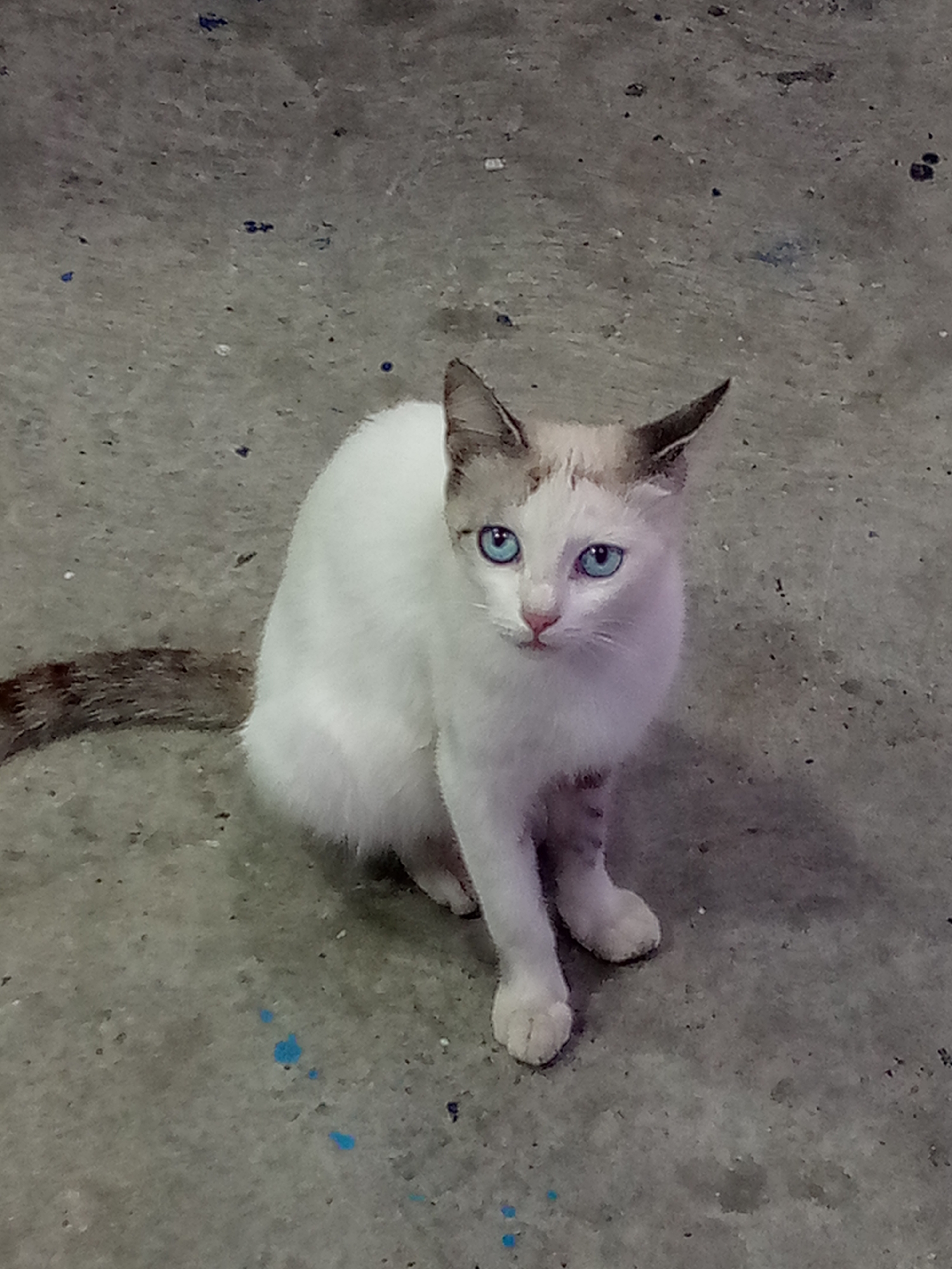 A medium shot shows a cat sitting on a concrete surface. The cat is mostly white with gray and brown markings on its head and tail. Its eyes are a striking blue. The concrete surface has a mottled texture and appears to be indoors. Small blue stains are visible on the concrete. The scene is set in an unknown location, and no people are present. The city of El Dátil, Venezuela is not directly visible in the image.