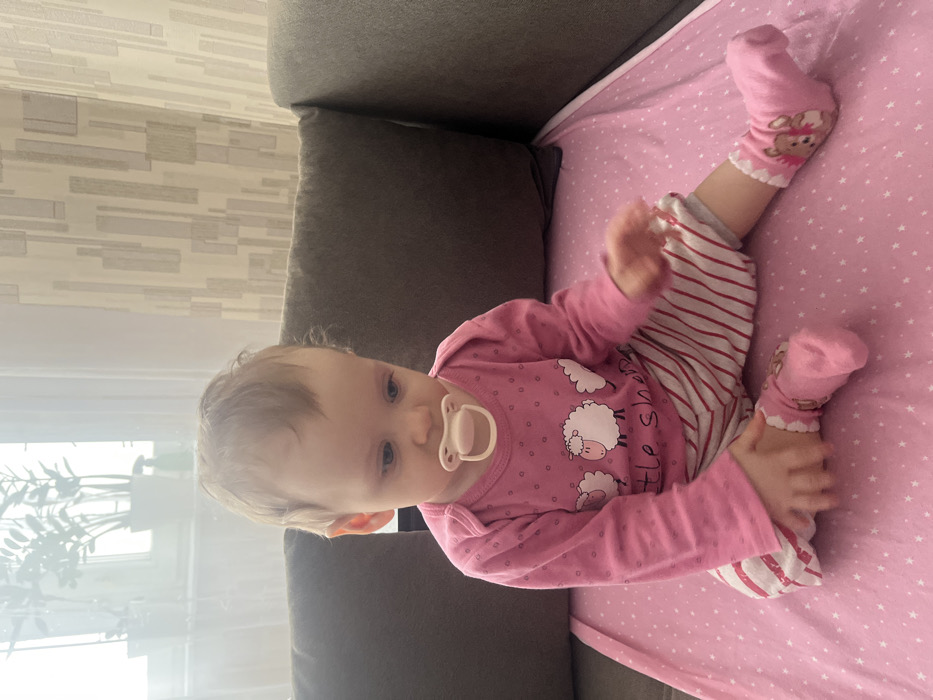 - "A baby is depicted seated on a dark grey sofa, atop a light pink mat patterned with white stars" by FM-qbqNu1, licensed under CC BY 4.0