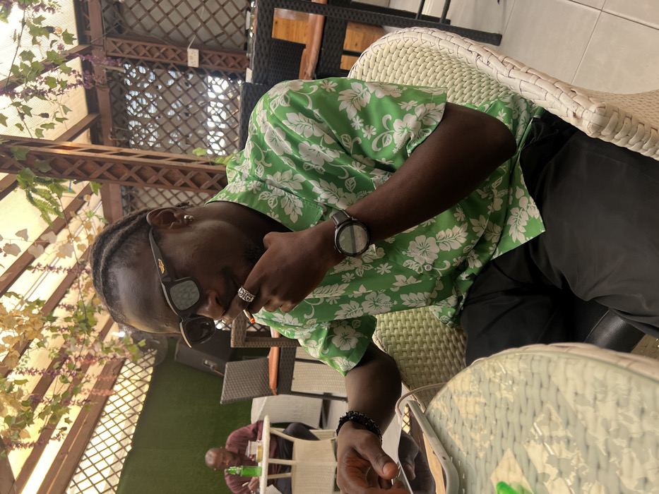 The image portrays an adult male seated at a round, glass-top table in an outdoor or semi-outdoor establishment located in Ikeja, Nigeria
