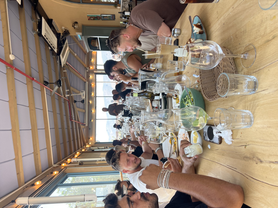 The image depicts an indoor dining area within a restaurant or eatery located in the Misgav Regional Council, Israel. A long, light-colored wooden table occupies the central and foreground space, accommodating approximately 15-20 individuals, predominantly young to middle-aged adult males. The establishment features large, expansive glass windows on the left and far side, providing a panoramic view of distant hills under a clear sky. The ceiling is constructed with exposed wooden beams, a light-colored infill material, multiple ceiling fans, and a visible red fire suppression pipe system. String lights are strung along the ceiling and walls. The table is densely covered with numerous clear glass carafes (some full, many empty), wine glasses (some containing liquid with lime slices, others empty), tumblers, and various plates holding food remnants and small serving dishes. A green bowl containing a salad is visible, as are small white condiment dishes with lemon or lime wedges. Bottles of wine, both open and closed, are present. In the right foreground, a man in a brown t-shirt with sunglasses on his head is seen in profile, drinking from a tall glass with a straw, likely an iced beverage. In the left foreground, a man with a mustache wears multiple silver bracelets on his left wrist and holds a small clear jar of white contents. Another man in a white t-shirt, mid-left, is smiling and looking down at the table. In the far background, a bearded man in a brown t-shirt stands facing the group, seemingly addressing them. A smartphone is visible lying face-down on the table in the foreground, near a crumpled napkin. The scene indicates a social gathering during daylight hours, centered around a shared meal.