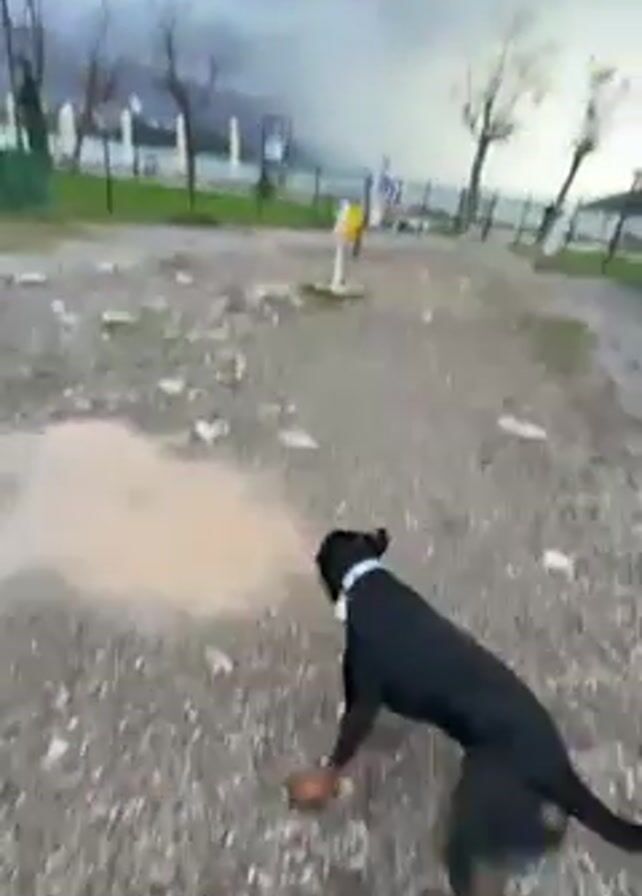 black and tan Doberman Pinscher dog running on a gravelly area towards the edge of what seems to be a park. The park overlooks a body of water, possibly a lake or the sea. The sky is overcast and a heavy downpour is visible in the distance over the water. There are a few trees without leaves and some green grassy areas. A yellow and white post is visible in the park area. The dog is wearing a white collar. The video appears to be taken with a moving handheld device.