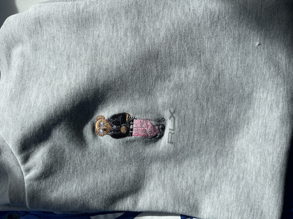 The image presents a close-up forensic view of a light grey textile garment, observed in Vieux, France. The central subject is an intricate embroidered motif located on the upper left portion of the fabric. This embroidery depicts a brown teddy bear figure, rendered wearing silver-rimmed sunglasses, a dark-colored jacket, and horizontally striped trousers in pink and white. Directly below the teddy bear, the stylized acronym "RLX" is embroidered in a metallic grey thread. The fabric itself shows subtle creasing and areas of shadow, indicating indirect or partially obstructed lighting conditions. No individuals are present in the frame, and no specific actions or interactions are depicted. The background appears to be the garment itself.