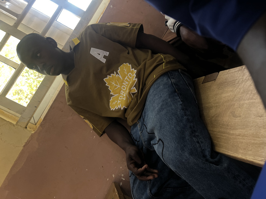 The image displays an indoor scene, consistent with a classroom or institutional building in Birnin Kebbi, Nigeria. A young Black male is seated on a light-colored wooden bench or desk, positioned towards the left of the frame. He has short dark hair and is looking upwards and to his right. He wears a collared, short-sleeved shirt in an olive-brown or mustard hue, featuring a prominent yellow maple leaf graphic with "TORONTO LEAFS" text and a large white letter "A" on the chest. He is also dressed in blue denim jeans with irregular black stitching patterns. The background wall is painted a reddish-brown color, showing some signs of wear. A window with a light-colored frame and multiple panes is visible in the upper background, allowing bright natural light into the space. A second individual is partially visible in the bottom right corner, wearing a dark blue garment with white and black striped cuffs, suggesting proximity to the primary subject. No specific actions or interactions are depicted beyond sitting and looking.