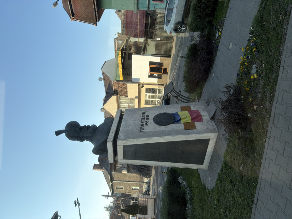 - "A dark-colored bust of a historical male figure, identified as Mihai Viteazul, stands atop a light grey and dark grey trapezoidal stone pedestal" by FM-PU0HJ3, licensed under CC BY 4.0