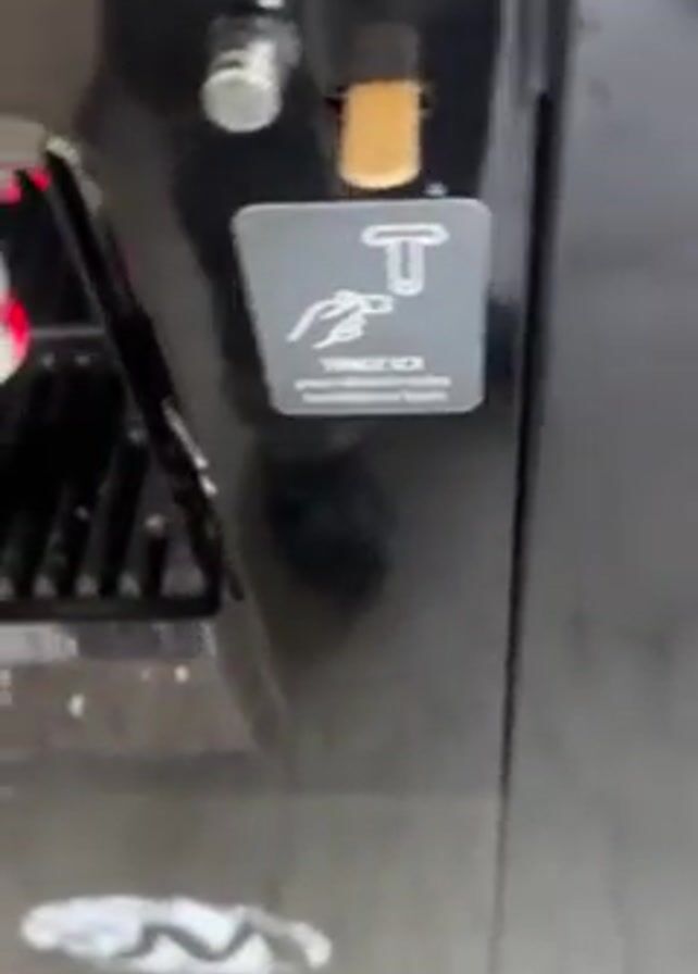 A hand pulls the handle of a black vending machine. A coin and some other debris fall out. The hand places a small white paper cup on a black tray in front of the machine.