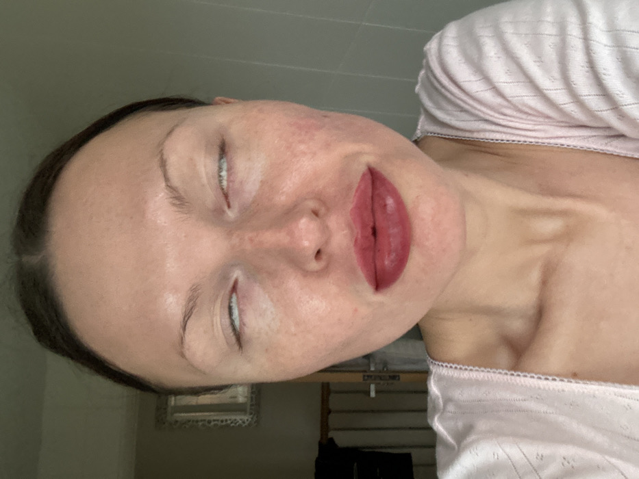 A female subject is captured in a close-up indoor portrait, specified as being in the city of Wealden, United Kingdom. Her dark brown hair is pulled back, revealing a high forehead. The subject's fair skin presents with freckles and diffuse redness, notably on the cheeks. Her eyes are rolled upward, exposing the white sclera, with eyelids partially open and light, thin eyebrows. Her lips are full, coated in dark red lipstick, and exhibit minor textural irregularities on the lower lip. The mouth is closed. She wears a light-colored, possibly pink, ribbed top featuring a scalloped neckline, revealing prominent clavicles. The background on the left includes a partial view of an ornate, white-framed mirror, a dark object, and a wooden banister. The background on the right is a plain light grey surface. The scene is illuminated by ambient light.