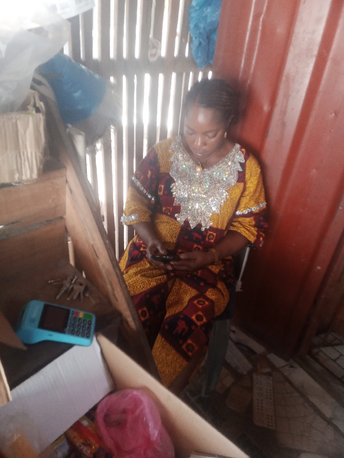 The scene depicts an adult female seated in a cluttered indoor environment, likely a small retail or office space, in Igrwre-Ovie, Nigeria
