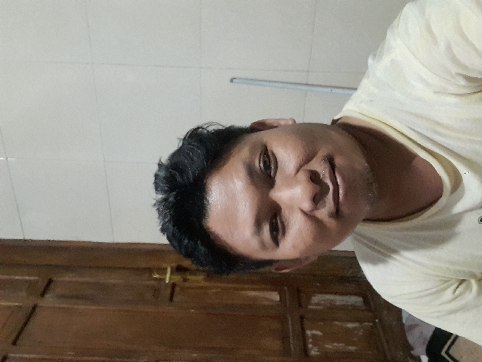 A male individual with dark, wavy hair, a light mustache, and a patchy chin beard is depicted in a close-up, chest-up shot. He wears a light yellow or off-white short-sleeved t-shirt and looks directly at the camera with a neutral expression. The background on the left features a dark brown wooden door, showing signs of paint chipping and wear, with a visible metallic handle. To the right of the individual, the background consists of a tiled wall with light-colored, horizontally arranged rectangular tiles. A thin, light-colored rod or stick leans against this tiled wall. The scene is indoors, located in Gelam, Indonesia.