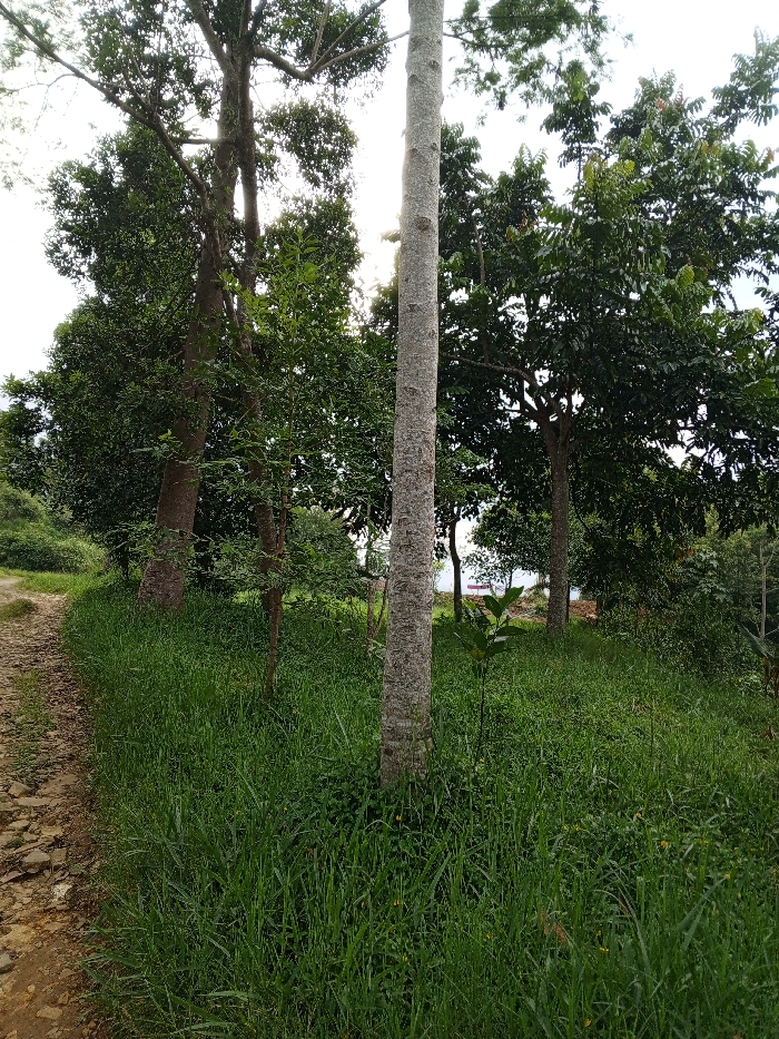 This image depicts a natural outdoor scene in Thotagamuwa, Sri Lanka. A rough, stony dirt path curves along the left side of the frame, leading into dense vegetation. The ground to the right of the path is covered in tall, vibrant green grass and smaller plants. A prominent, light-barked tree trunk stands vertically in the mid-right foreground, with a smaller sapling, possibly a young jackfruit plant, growing at its base. Behind this, several large trees with lush green foliage dominate the midground and background, their canopies obscuring the sky in many areas. Sunlight filters through the leaves and branches from behind the trees, creating a bright haze. In the distance, beyond the trees, a faint red structure is visible, suggesting human presence or a distant object, possibly near a body of water or open area. No individuals or animals are present.