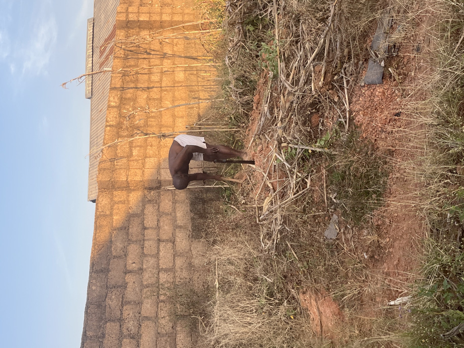 A man wearing light-colored shorts stands in a rural setting. He is bent over, apparently working with a tool in the dirt and dry brush. To his left is a tall, brick or stone wall, perhaps of a building, under a blue sky. The ground is covered in dry grass, weeds, and some scattered debris. The image is rotated ninety degrees clockwise.