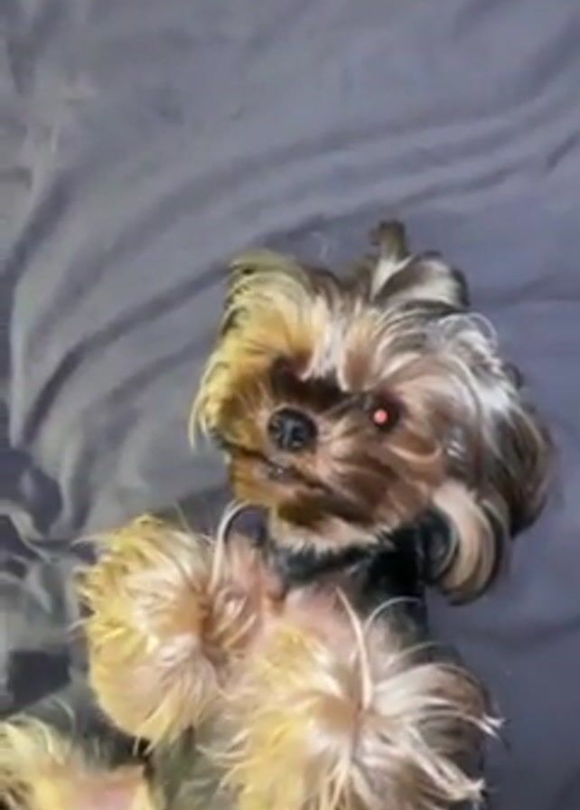 A small, long-haired dog with tan and black fur is lying on its back on a grey blanket. The dog is wearing a black collar and has its paws curled up towards its chest. It is looking towards the top right of the frame. One of its eyes appears red in the video.