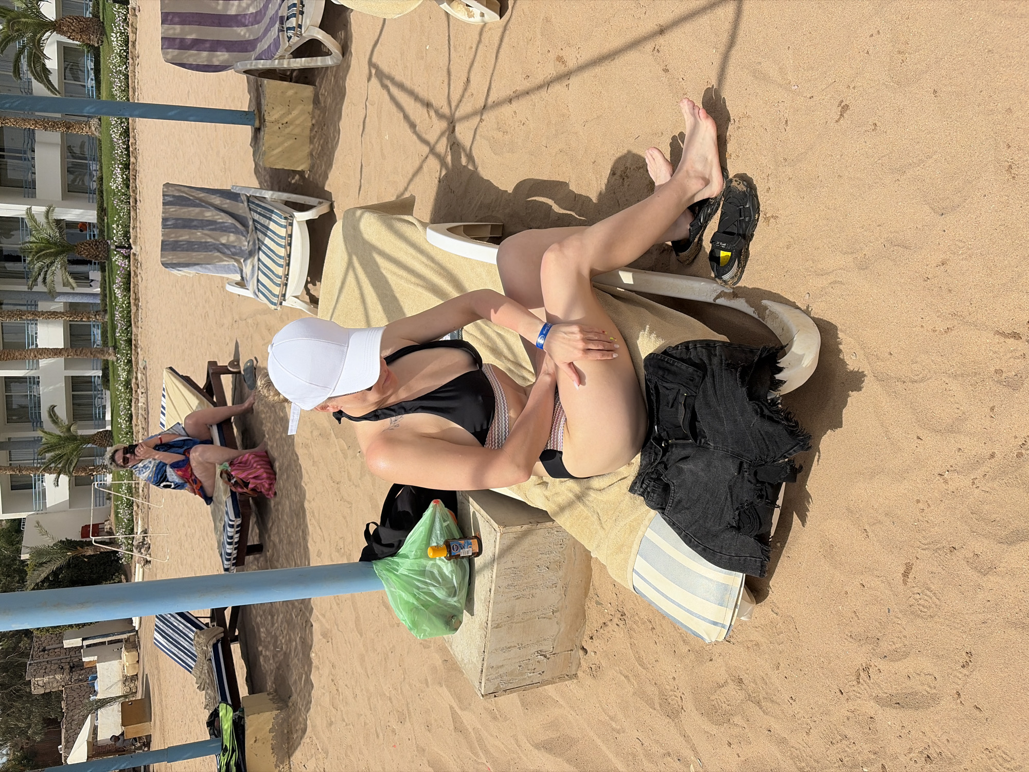 A woman in a black bikini and white cap is sunbathing on a beige lounge chair on a sandy beach. She is lying on a towel, with her feet positioned towards the top right of the frame. Next to her are black sandals and a pair of ripped black denim shorts. A plastic bag containing a bottle of sunscreen is placed on a concrete block beside the lounge chair. In the background, other sunbathers are lounging on striped beach chairs. Palm trees and buildings are visible behind the beach chairs. The location is most likely Sharm El Sheikh, Egypt.