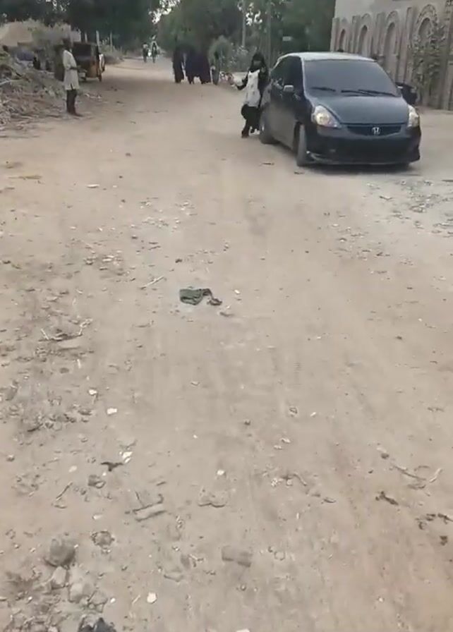 A black Honda Fit stops on a dirt road. A woman in a black burqa opens the back door and exits the car. In the background, several people in dark clothing walk down the road. There is debris scattered on the ground. A man stands near a pile of brush, and an auto rickshaw is parked nearby.