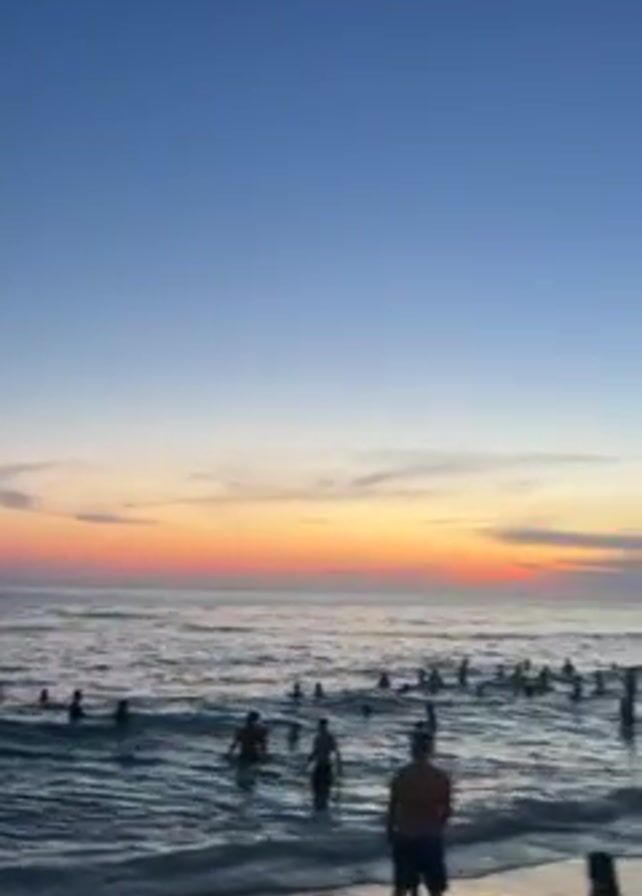 beach at sunset. The sky is blue with orange and yellow hues near the horizon. Many people are swimming in the ocean or standing at the shoreline. There are buildings and mountains visible in the distance. The camera appears to be static, capturing a wide shot of the scene.
