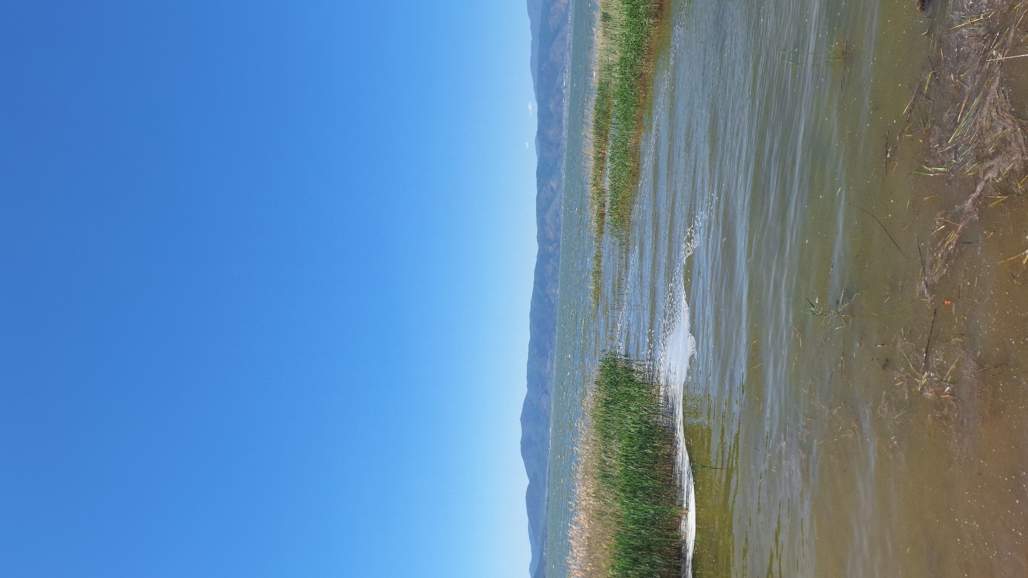 The image depicts a body of water, possibly a lake or river, with reedy vegetation lining the edge