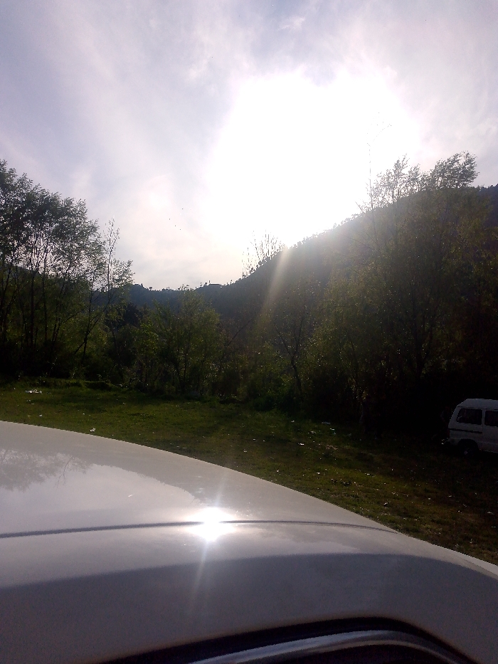 The image presents an outdoor, natural landscape located in the vicinity of Dharyal, Pakistan. The foreground is occupied by the light-colored, reflective surface of a vehicle, possibly the hood or roof, which shows a prominent sun glare. The midground features a grassy area interspersed with green trees and shrubbery. A light-colored van, likely white or silver, is partially visible parked on the grassy terrain on the far right. The background consists of a sloping hillside or mountain range densely covered with trees. The sun is intensely bright in the upper right portion of the frame, casting a strong glare and lens flare across the scene and partially obscuring visibility of the hillside. The sky above is bright white with diffuse cloud cover. Several small, dark specks, consistent with birds or insects, are discernible against the sky in the upper left and central areas. No individuals are visible, and no active interactions are depicted. Small white fragments, possibly litter, are scattered on the grass in the midground.