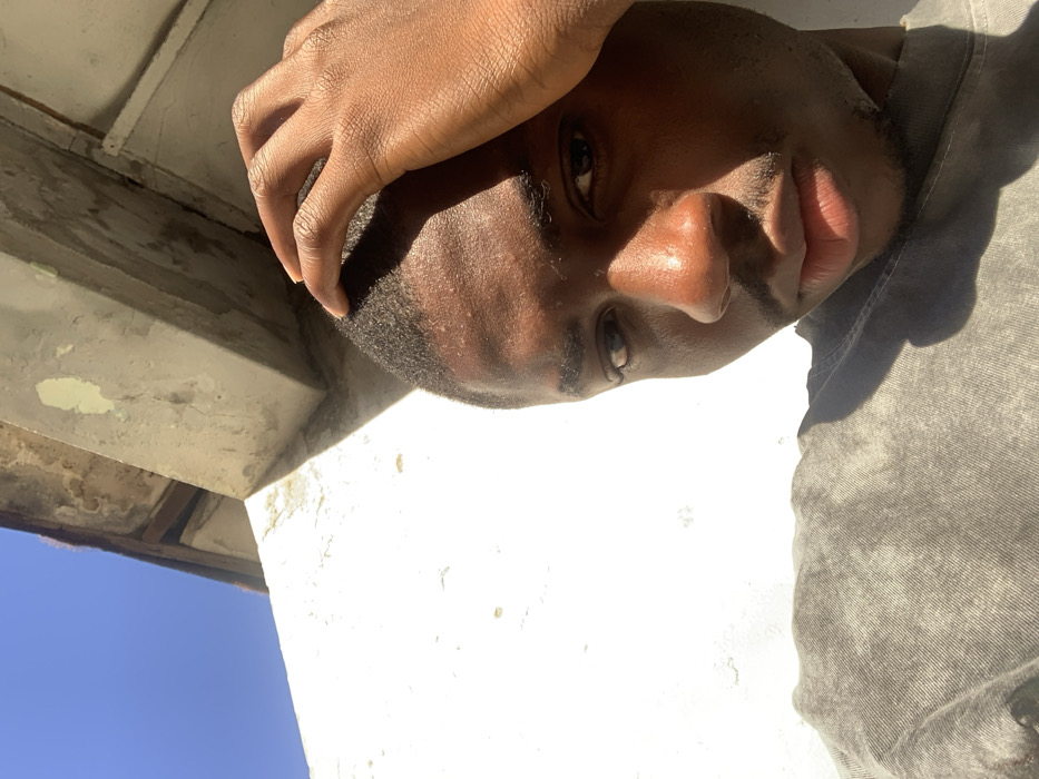 An image shows a man's face in close-up, slightly tilted. He has dark skin and short, dark hair. His hand is resting on his forehead. Sunlight highlights his features, creating strong shadows. The background includes part of a building with peeling paint and a glimpse of blue sky. He is wearing a gray shirt. The overall perspective is looking upwards.