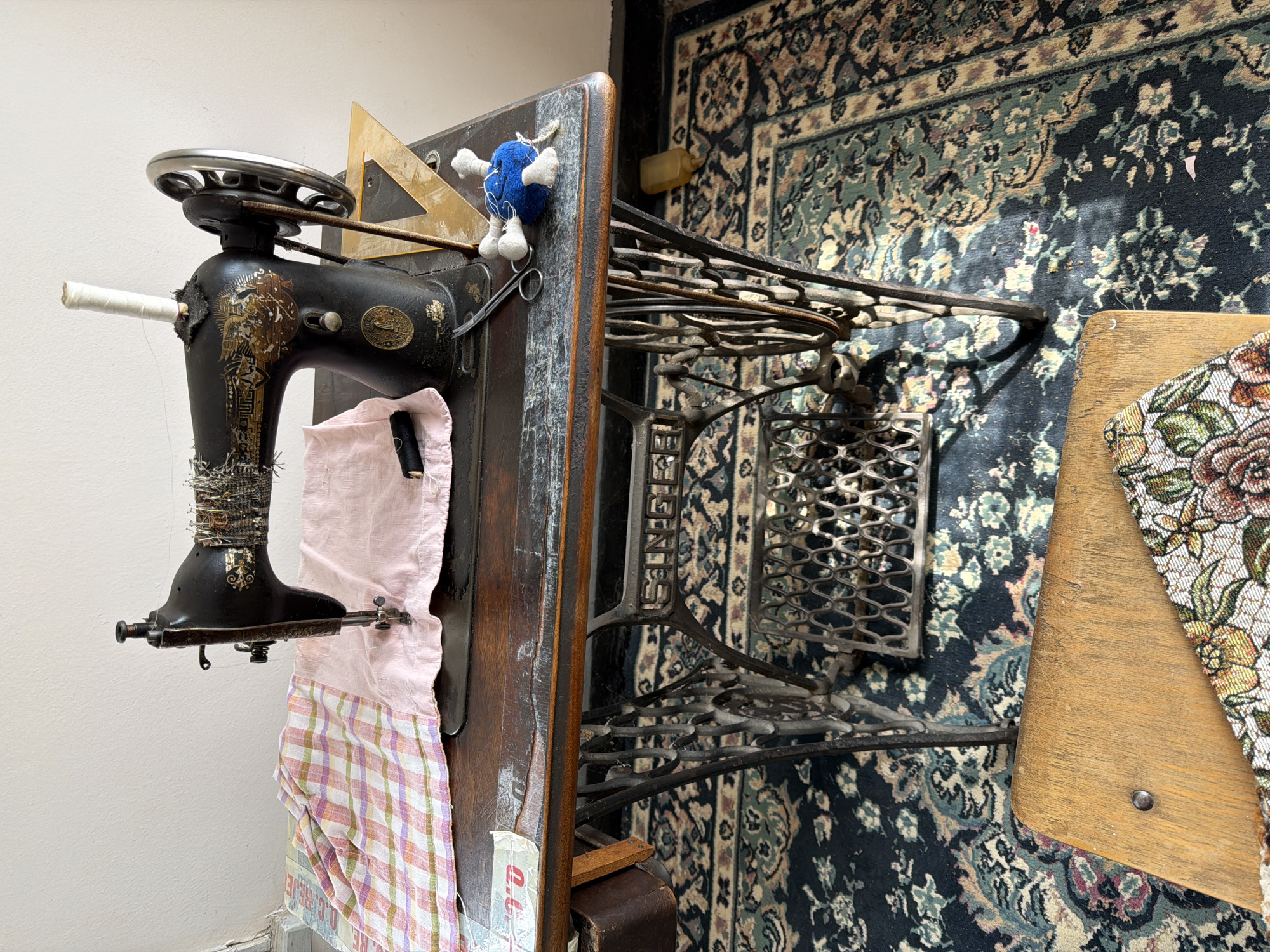 The image depicts an antique Singer sewing machine with a black body, positioned on a wooden table. A pink and plaid cloth drapes from the machine. A triangular ruler and a blue pincushion with white arms are visible near the top of the table. The sewing machine is on a metal stand with ornate details. A patterned rug with dark blue, green, and beige colors covers the floor. A wooden chair partially covered with a floral fabric is situated near the rug. The location in the city of Kutovo, Bulgaria, cannot be determined from the image.