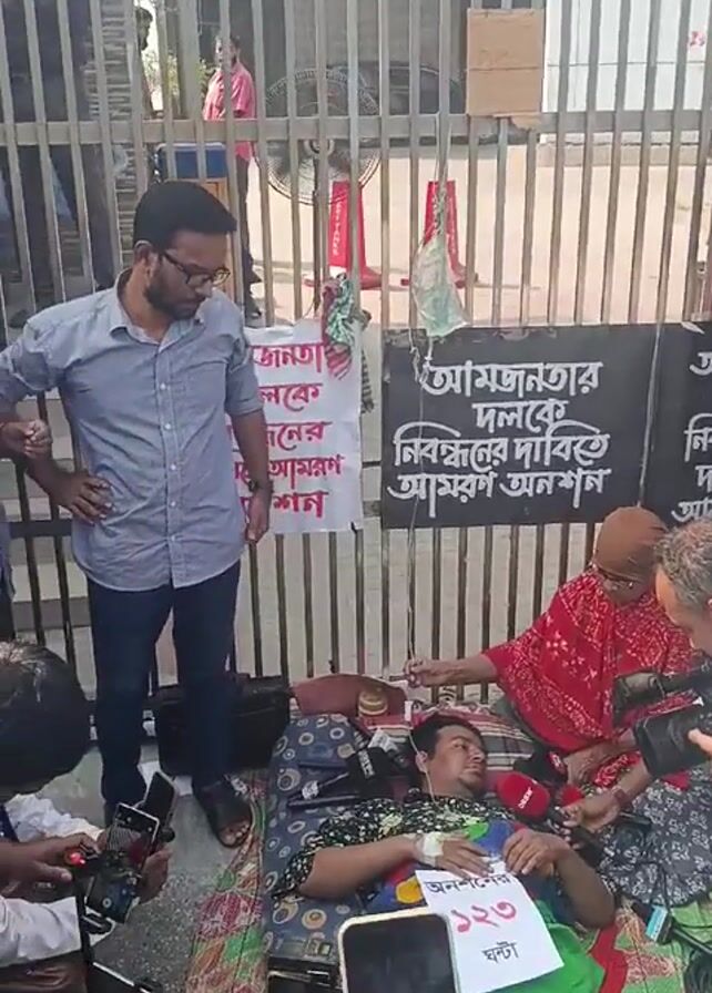 In front of a gray metal gate, a protest is taking place. A person lies on a mattress on the ground, with a sign saying “১২ ঘণ্টা” (12 Hours) in front of them. An older woman wearing a red shawl appears to be attending to the person on the mattress, and another woman in a hijab is nearby. Several people are gathered around, some filming with their phones. There are also posters visible on the gate, written in Bengali. One person in a red shirt is taking video with a professional camera and microphone.
