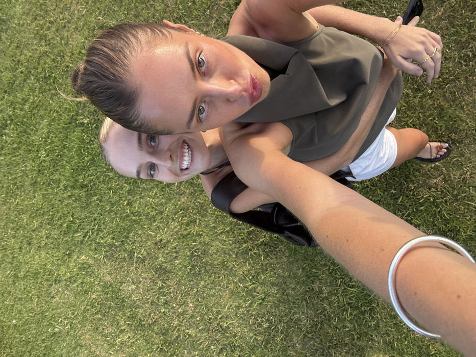 Two women pose for a selfie, likely outside, on a grassy lawn. One woman is fair-skinned with blonde hair pulled back and wearing a black top. She smiles broadly. The other woman is positioned behind and above, her light brown hair in a bun. She wears a green sleeveless top and white shorts. The selfie extends to include the arm holding the phone, featuring a silver bangle bracelet, and a glimpse of a black sandal on the left side of the frame.