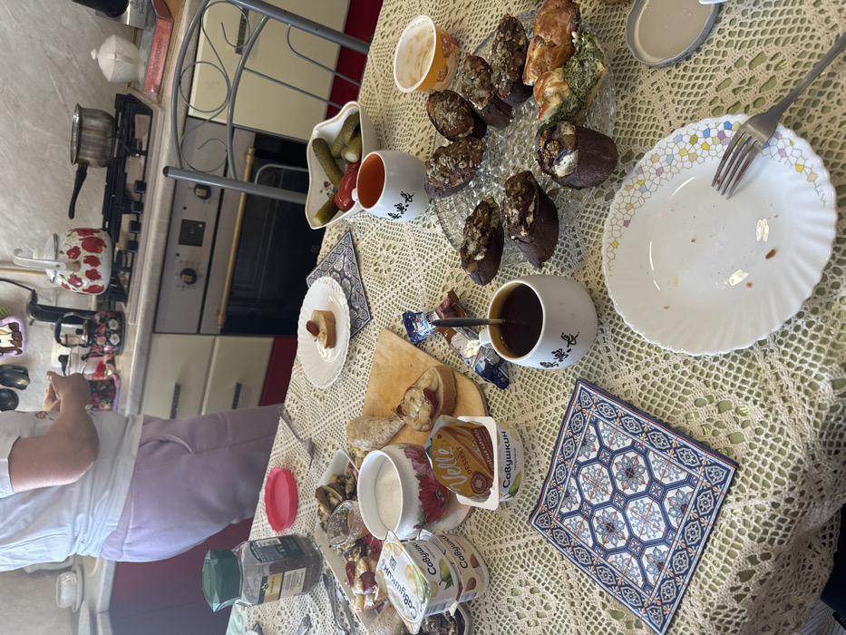 The image depicts a domestic kitchen and dining area in Klementyevo, Russia, with a table laden with food in the foreground and a person standing at a kitchen counter in the background