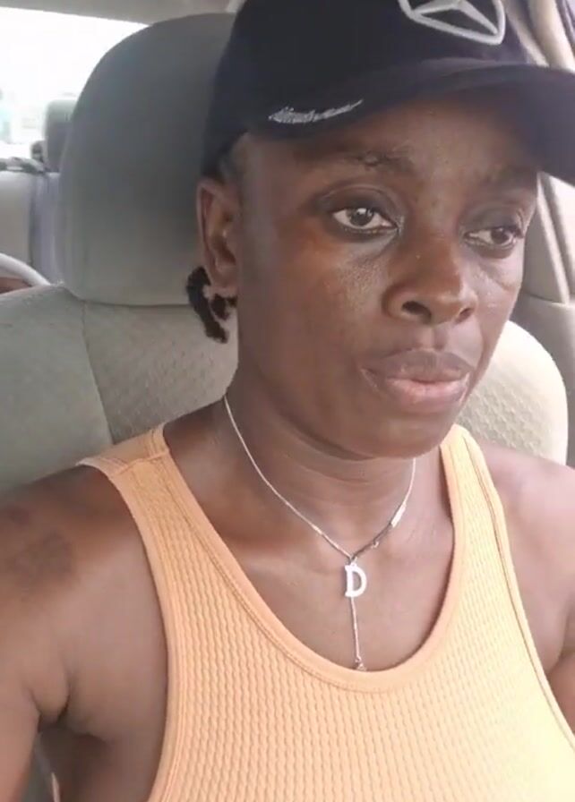 A woman with dark skin, wearing an orange tank top and a black baseball cap with a white Mercedes-Benz logo, is sitting in the driver's seat of a Toyota Camry. She has a silver necklace with a "D" pendant. Her nails are painted orange. She is driving on a city street with other vehicles visible in the background. The car's interior is visible, including the steering wheel, dashboard, and seats. She looks directly at the camera and then glances at the road while driving.