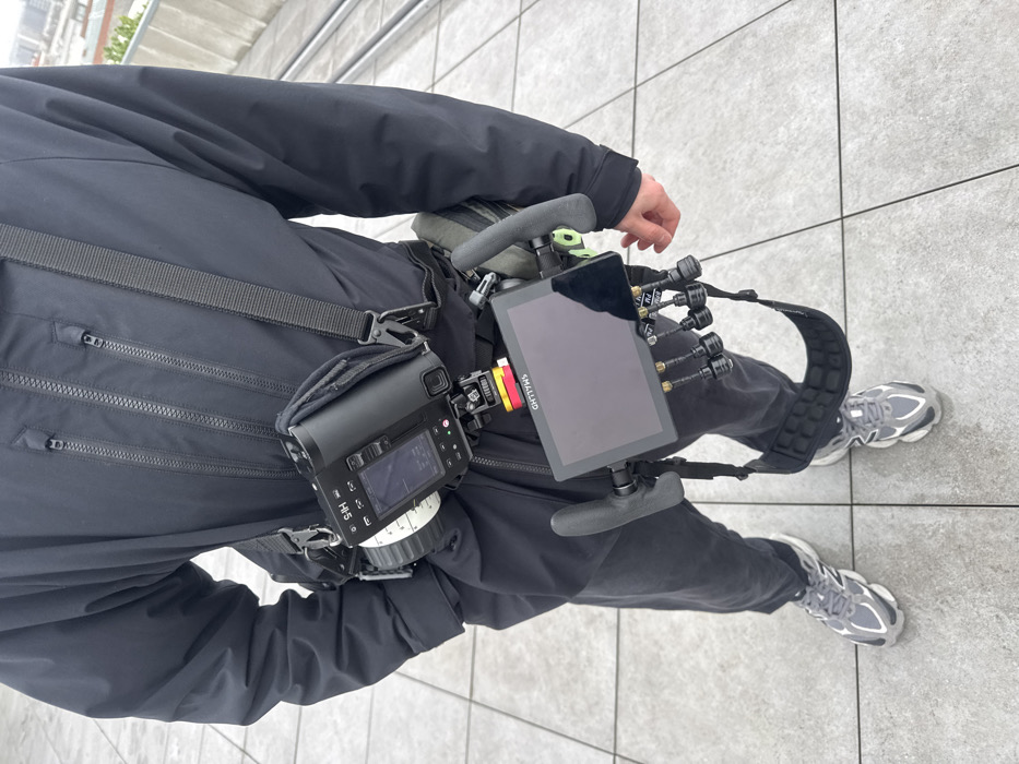 A person stands on a light grey tiled surface in Ivry-sur-Seine, France, viewed from the chest down. The individual wears a black technical jacket, dark trousers, and grey New Balance athletic shoes. A specialized camera rig is attached to their torso. The rig comprises a black Panasonic Lumix S1H camera with a large white-ringed cine lens and an attached audio recorder, positioned on the chest via a harness system. Below the camera, a black SmallHD monitor, equipped with side handles and multiple black connectors protruding from its base, is mounted and supported by a padded waist strap. The person's right hand is visible near the monitor's right handle. The background shows a blurred urban landscape with a metal railing, indicating an elevated outdoor location.
