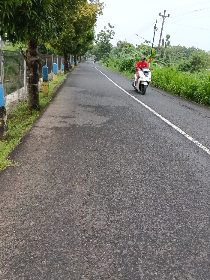 A straight, asphalt road stretches into the distance, flanked by green trees and roadside barriers on the left. A single white line marks the lane division. A person in a red shirt rides a white scooter towards the viewer, holding a long pole aloft. Lush greenery grows on the right side of the road, and telephone poles rise in the background. The road surface appears slightly wet.